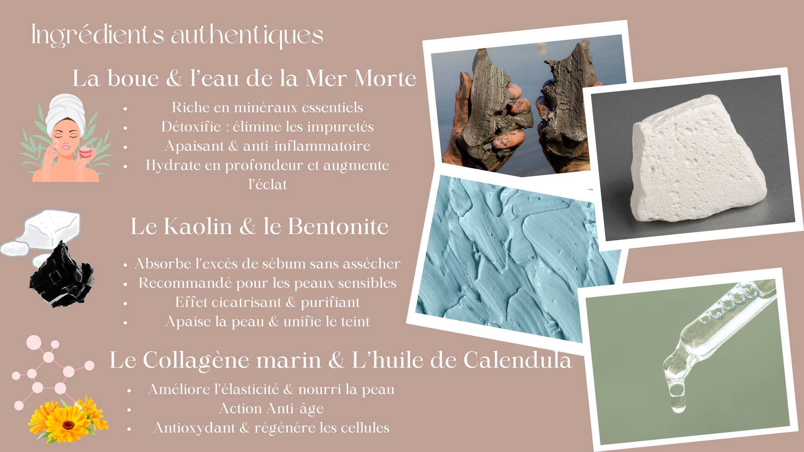 Boue de la Mer Morte : 44,5%, Eau : 20,5%, Argile blanche 9%, Argile volcanique 8%, Glycérine 6,5%, Monopropylène Glycol3,5%, Dimethicon 2,5%, Collagène marin 2%, Huile de Calendula 1,5%, Huile d’Argan 1,5%, Vitamine E 0,1%, AHA 0,1%, Vitamine C 0,1%, Extrait de Lavande 0,1%, Acnibio 0,05%